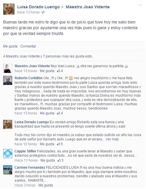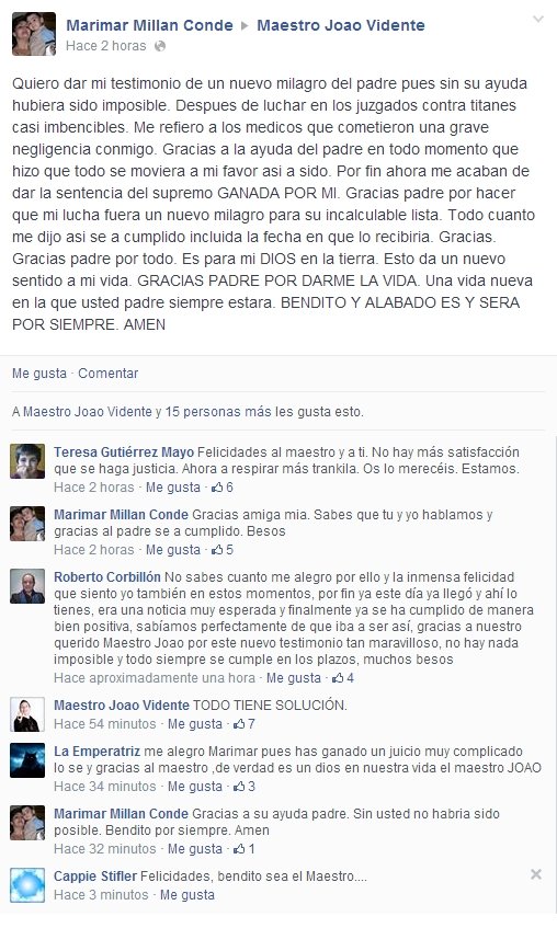 Todos los testimonios son importantes ya que todos tratan temas que son de gran preocupación para las personas que tienen problemas. Sin embargo, un testimonio de sanación es siempre de especial importancia debido a sus implicaciones. Todos sabemos que, cuando falta, la salud es lo que más nos importa. Si tenemos a un ser querido enfermo, daríamos cualquier cosa por su sanación… Hoy tenemos un nuevo testimonio de Benita que estaba muy preocupada por la salud de su hijo y hoy nos cuenta con alegría su sanación. Las noticias que tenía Benita sobre la salud de su hijo no eran buenas pero con mucha fe hizo que se bañara con el gel de San Judas de «El Templo del Maestro Joao«, y que llevara el amuleto que yo preparé y ritualicé para él. Saber que mi energía pránica con ayuda de San Judas y la fe de Benita han logrado la sanación de su hijo me produce una inmensa satisfacción y alegría. Maestro Joao El Templo del Maestro Joao Cardenal Siliceo, 9 28002 Madrid Tel.: 914347566