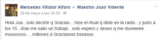 «Hola Joao, solo decirte que Gracias, hice el ritual que diste en la radio y justo a los 15 días me salió un trabajo. Solo espero y deseo que me dure mucho, millones de gracias» Mercedes Villalar.