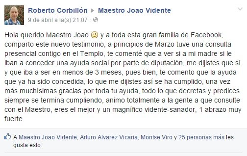 «Hola querido Maestro Joao y a toda su gran familia de Facebook. Comparto este nuevo testimonio, a principios de Marzo tuve una consulta presencial contigo en el Templo, te comente que a ver si mi madre le iban a conceder una ayuda social por parte de la diputación, me dijiste que si y que iba a ser en menos de 3 meses, pues bien, te comento que la ayuda ya ha sido concedida. Una vez más muchísimas gracias por toda tu ayuda , todo lo que decretas y predices siempre se termina cumpliendo. animo a la gente a que consulte con el Maestro, eres el mejor y un magnifico vidente-sanador» Roberto Corbillon.