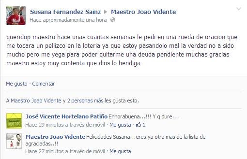 «Querido Maestro hace unas cuantas semanas le pedí en una rueda de oración que me tocara un pellizco en la lotería ya que estoy pasándolo mal, la verdad no ha sido mucho pero me llega para poder quitarme la deuda pendiente. Muchas gracias Maestro, estoy muy contenta. Que dios lo bendiga» Susana Fernandez.