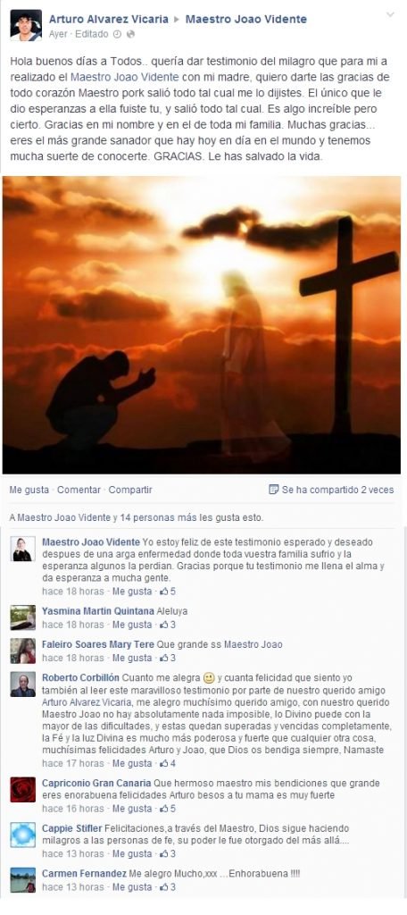 «Quería dar testimonio del milagro que para mi ha realizado el Maestro Joao Vidente con mi madre, quiero darte las gracias de todo corazón porque salió todo tal cual me dijistes. El único que le dio esperanzas a ella fuiste tu y salió todo tal cual. Es algo increíble pero cierto. Gracias en mi nombre y en el de toda mi familia. Muchas Gracias. Eres el más grande sanador que hay hoy en día en el mundo y tenemos muchas suerte de conocerte. Le has salvado la vida» Arturo Alvarez