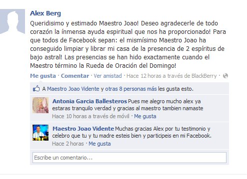«Querido Maestro y queridos amigos de las redes sociales. Hoy el maestro ha obrado otro milagro en mi vida. Le había escrito esta mañana temprano porque en mi trabajo esperaba una promoción que tardaba en llegar. Las cosas se habían bloqueado desde varias semanas. Ahora bien, al medio día me han contactado dándome muy muy buenas noticias. Es increíble como en poquísimas horas el Maestro haya cambiado completamente una situación que estaba bloqueada desde tiempo. Además que he recibido un trato muy favorable en lo que esperaba. De verdad amigos os ánimo a contactar con el Maestro, os lo digo porque es mi amigo, porque es verdaderamente milagroso y siempre acierta en lo que dice y hace. si ponéis vuestra confianza en él os ponéis en las mejores manos posibles, garantizado. Es el número 1 no solo en España sino de todo iberoamérica»